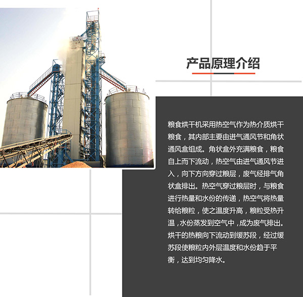 需烘干的湿粮经均粮机构进入粮食烘干机,当粮食到达储粮段的低料位时,启动热风机开始送热风对粮食烘干;粮食到达储粮段中料位时,料位器动作,发出电信号启动排粮电机开始排粮;粮食到达储粮段高料位时报警,进粮停止。此时,排粮继续进行,粮位开始下降,当降至中料位时,恢复进粮,如此循环进行。调整进料量,使系统处于动态平衡。湿粮经过储粮段进入布风段后,均匀的分布在布风段内的各通风节管内,热风在通风节管外流动,对粮食加热;然后粮流和热风同时向下流动,进入烘干段,在烘干段内对粮食加热,使粮食水分汽化,再以废气形式将汽化水分从废气角状盒排出,从而使粮食得到烘干。烘干后的粮食在冷却段内经过冷却降低到合适的温度后,由排粮段经排料斗排出。