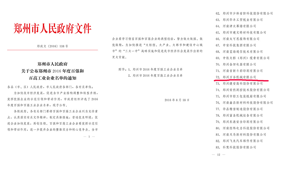 郑州市政府为加快郑州市经济发展、促进全市产业结构调整和转型升级,发挥优强企业的示范引领和带头作用,在全市范围内进行2016年度百强和百高工业企业评选。